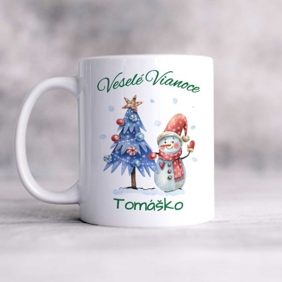 Detský vianočný hrnček – Veselé Vianoce, stromček a snehuliak s menom